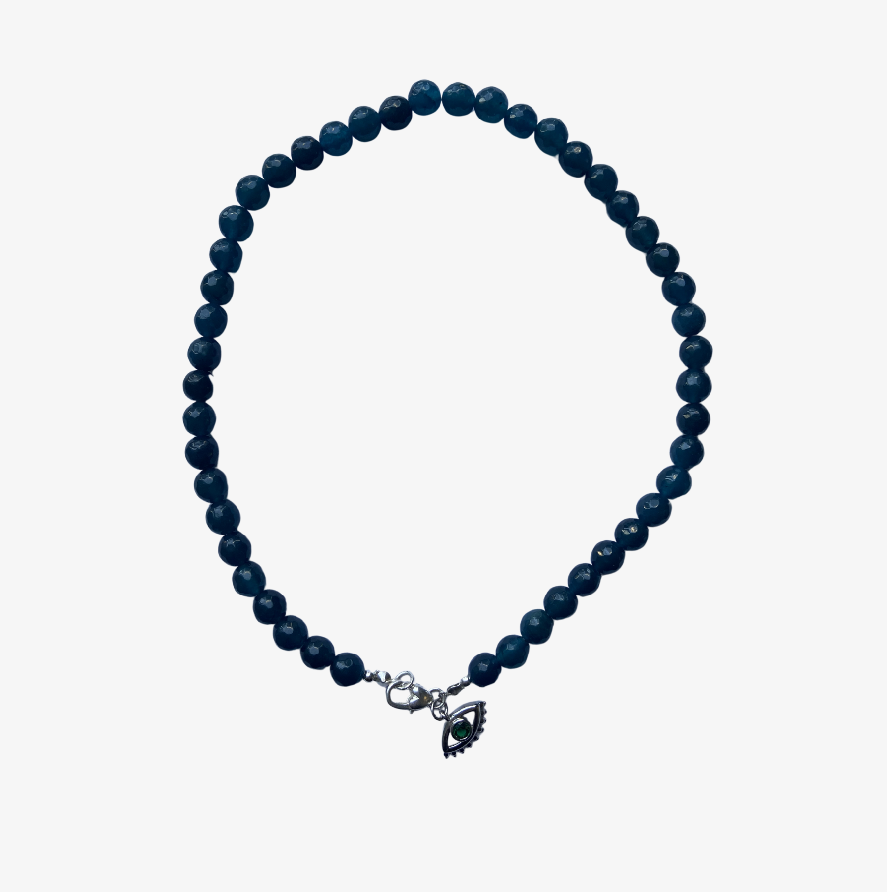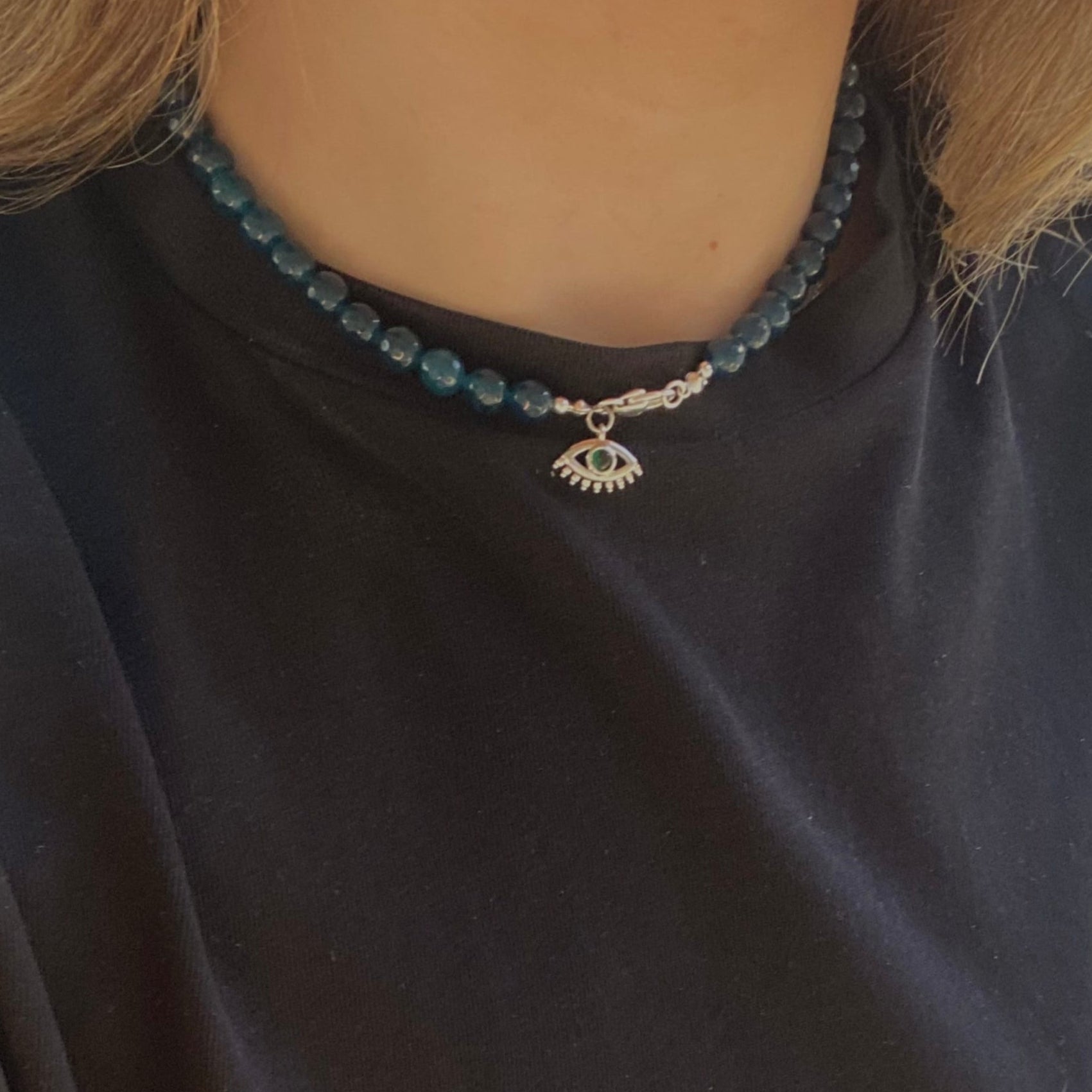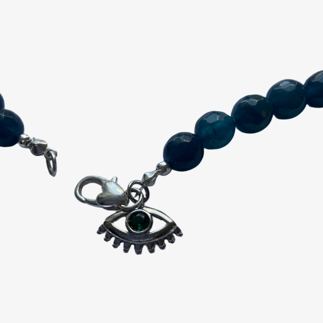 con mostacillas de ágata facetada en un hermoso tono verde petróleo ,este collar presenta un mini colgante de ojo turco y un broche en forma de corazon bañado en plata, un diseño que transmite protección y amor.